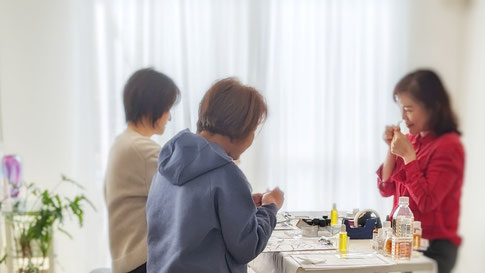 この講座では、毎回の講座の前半を「アロマテラピー基礎講座」、後半を「アロマクラフト実習」として、アロマの効能を理解してからエアーフレッシュナー、アロマコスメ、マッサージオイル作りをおこないます。机上の学びよりも多くの実習を通じて、楽しみながら、体験しながらアロマに触れて、五感を通して学ぶスタイルで学習を進めます。